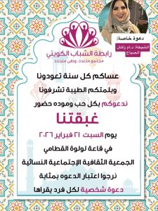 في “قاعة لولوه القطامي” بالجمعية الثقافية الاجتماعية النسائية، وفي يوم السبت الحادي والعشرين من فبراير ٢٠٢٦، ستنسج خيوط المودة حكايةً جديدة. هي دعوةٌ لم تُكتب بالحبر، بل بصدق الانتماء، نُثرت لكل عينٍ تقرؤها كدعوةٍ شخصية، لتكتمل لوحةُ الوطن بوجوهكم الطيبة، ولتظل الكويت – كما عهدناها – منبعاً للوفاء، وموطناً للألفة التي لا تغيب