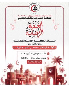 تحت رعايةٍ كريمة من معالي وزير الصحة، الدكتور أحمد عبد الوهاب العوضي، وبنفحاتٍ تفيضُ بمودة الشهر الفضيل، أقامت الجمعية الطبية الكويتية احتفاليتها السنوية (الغبقة الرمضانية) وحفل تكريم الروابط، وذلك في فندق “جراند حياة” بمول 360، في أمسيةٍ تجسدت فيها أسمى معاني التقدير والوفاء.